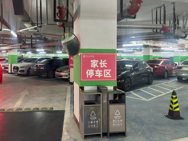 走进地下接送岛,清晰的引导标识、黄色斑马线、家长休息区一应俱全。针对不同学段特点,学校做了细致安排:建议小学低段家长在车位停稳后,经地下斑马线步行至岛内接送;下午放学时,家长可在专用休息区等候,告别了路边的风吹日晒。
