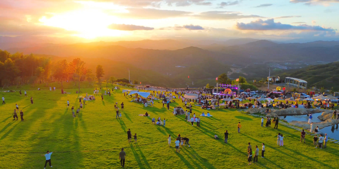 在这里,帐篷缀于绿野,风携青草芬芳,看落日染遍天际,听晚风轻拂耳畔,枕山望野,尽享草坪撒欢之乐。