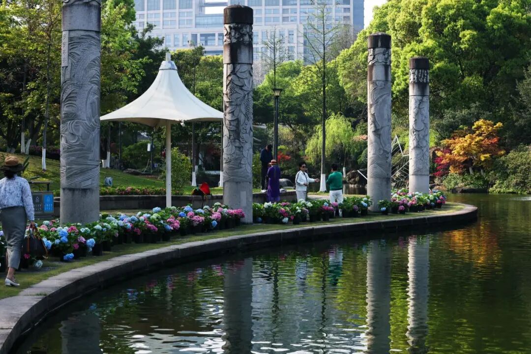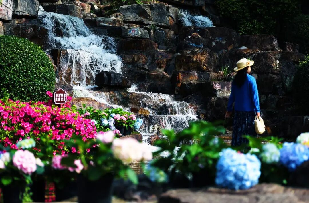 沿主池东侧步道前行,蓝、黄、粉各色绣球搭配,如打翻的调色盘,在石柱与绿树的映衬下热烈而雅致。东面杜鹃精品园中,淡紫与粉色的绣球簇拥着怒放的玫红、紫色杜鹃,星星点点的白花点缀其间,共同奏响华美序章。