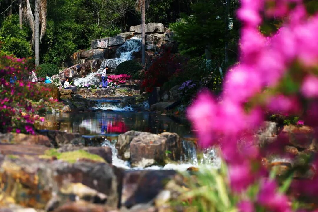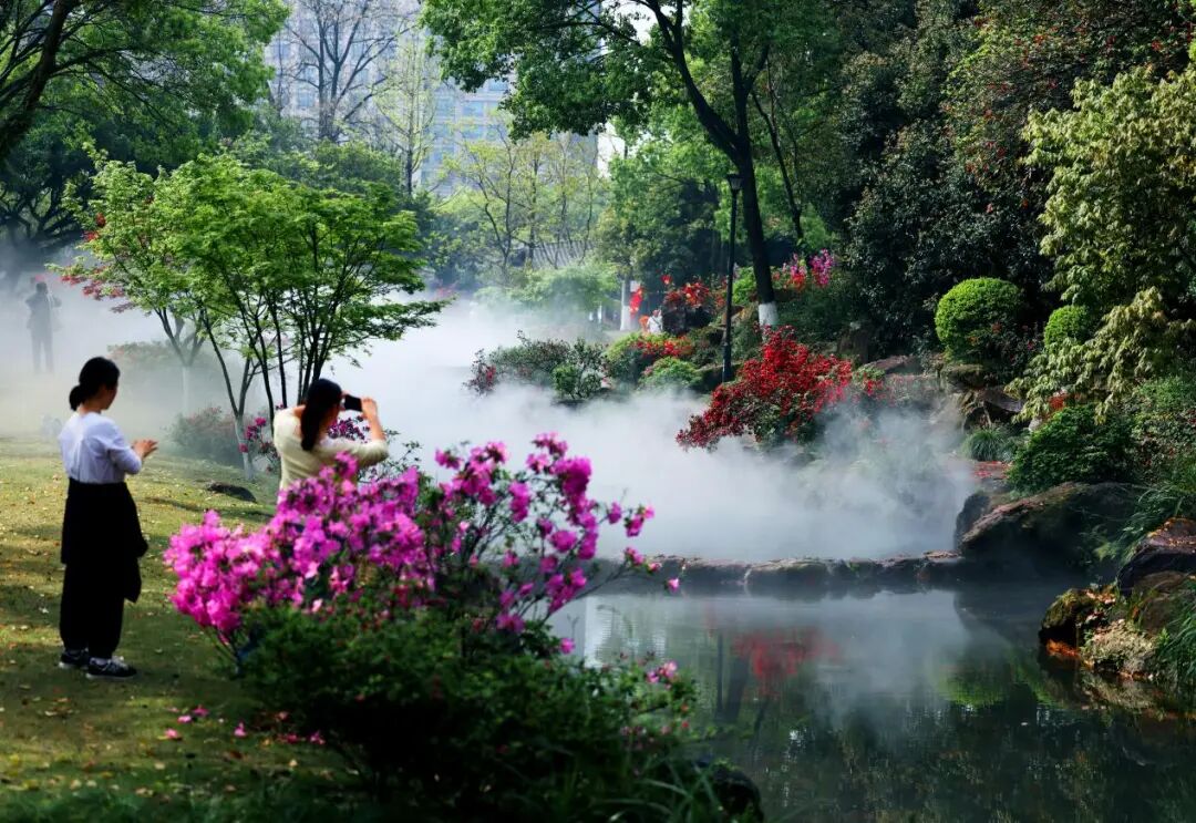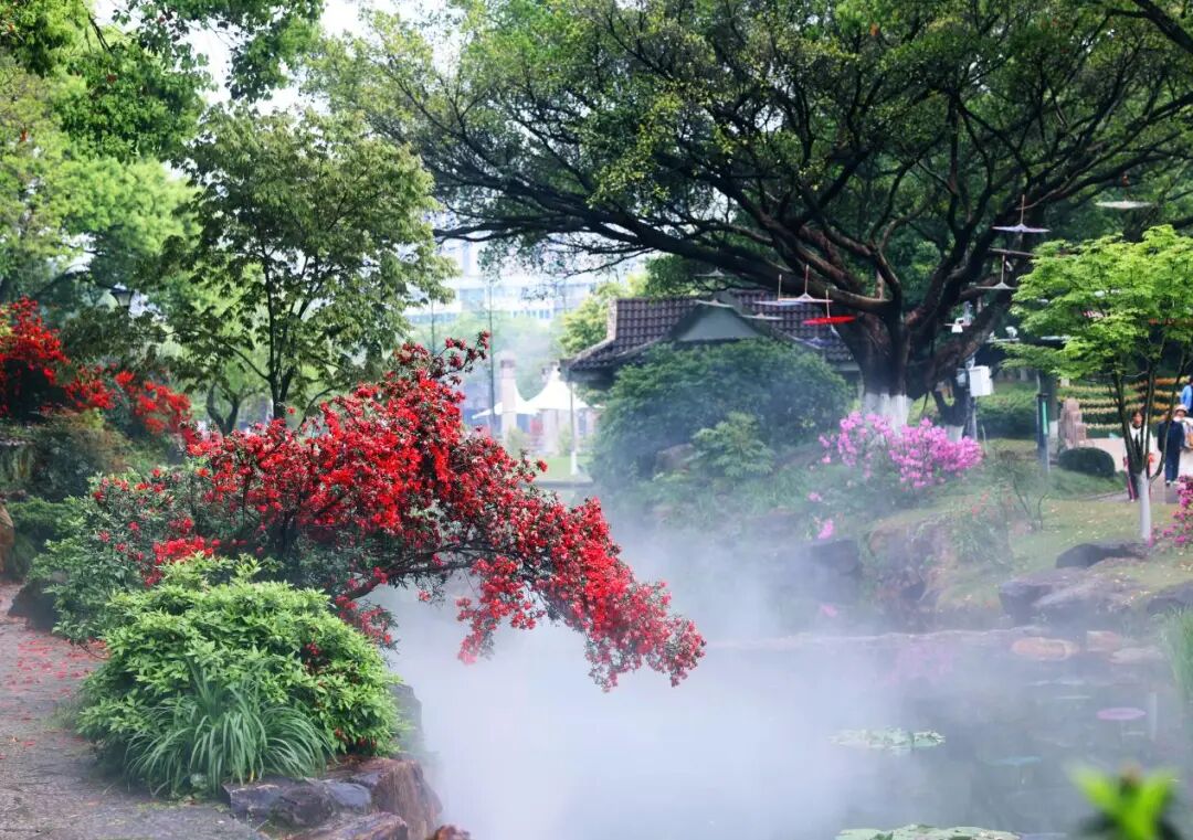 叠水瀑布潺潺流淌,自深褐岩石泻入溪沟,奏响自然乐章。新增的雾森系统更添诗意,水汽氤氲,阳光穿过林间,缠绕如火的花丛,瞬间营造出“繁花似锦、雾漫仙境”的油画质感。石阶上、水岸边,处处是拍照打卡的游人,红、紫杜鹃倒映碧水,出片率极高,堪称春日流量担当。