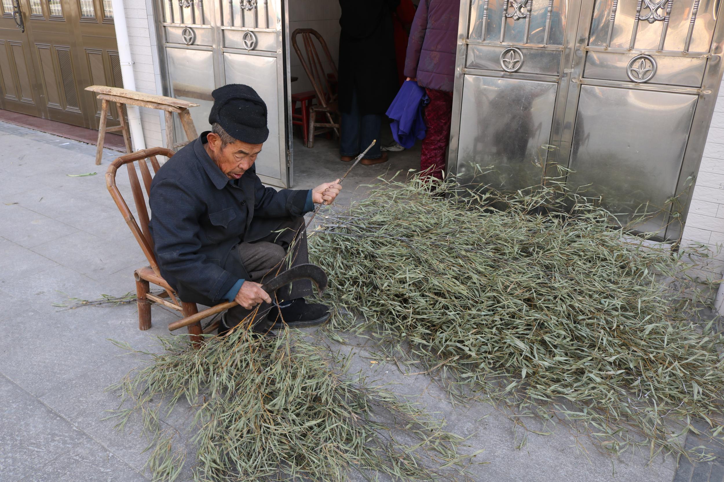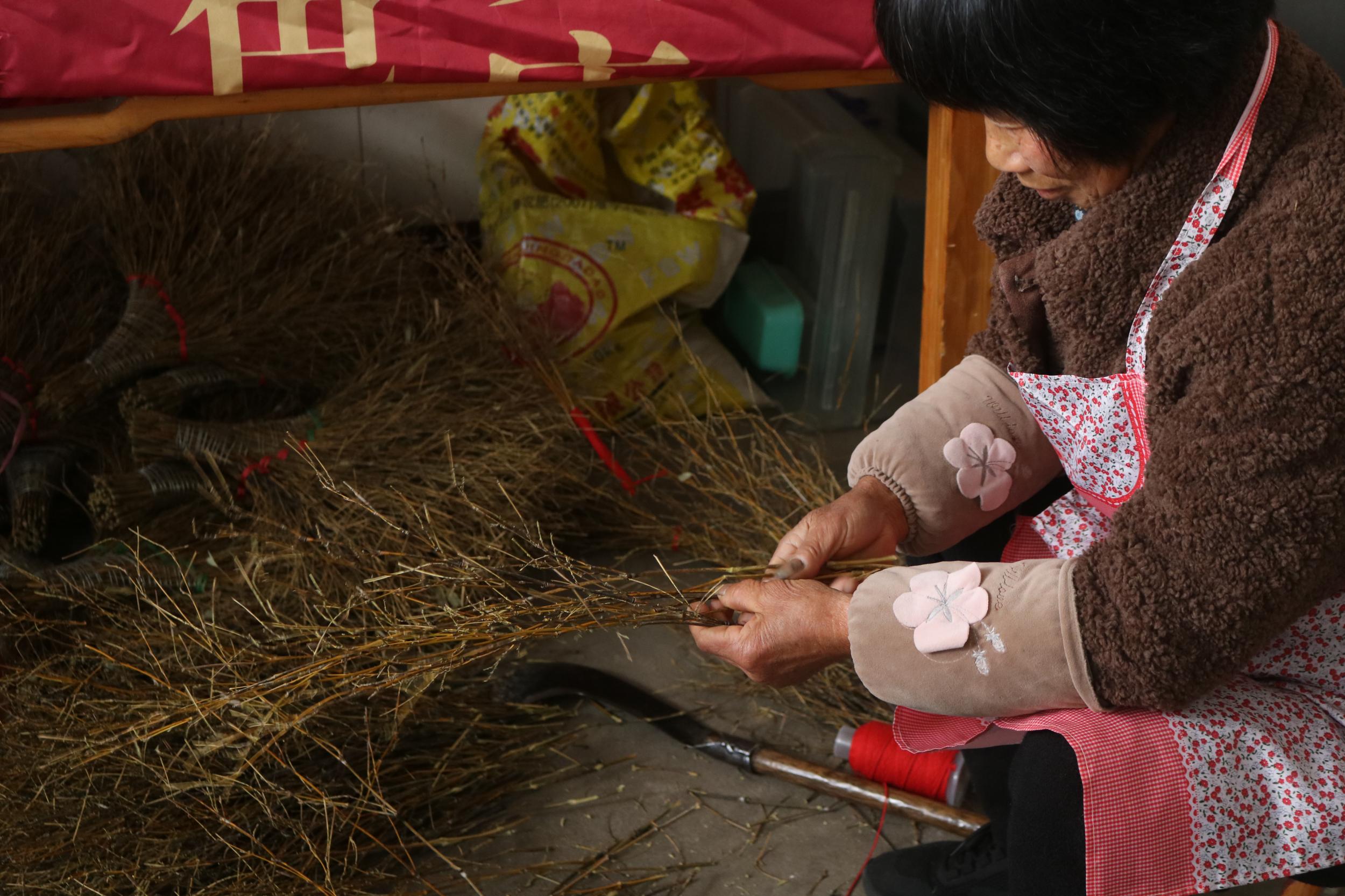 包装解决了,但产品制作同样面临挑战。在温州农村,懂得如何挑选韧性好的枝条、知道如何修剪才算地道的“老师傅”已不多见。蔡闽参在各村寻找曾做过扫把的老人,由他们担任“老师傅”,再带动周边村民参与。村民们负责上山收集废弃枝条,蔡闽参统一提供红绳、标签、包装盒,村民们只需按样品加工制作,合格的产品统一收购。
