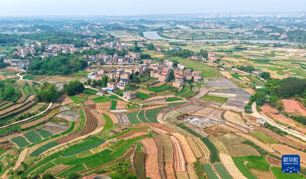 时下,广西南宁市邕宁区蒲庙镇田园色彩斑斓,与河流、村庄、山峦、道路相映成景,铺展出一幅生机勃勃的春日画卷。这是4月9日拍摄的广西南宁市邕宁区蒲庙镇田园景色(无人机照片)。新华社发(方永涛 摄)