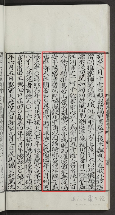 由于台风往往带来严重灾害,明弘治《温州府志》将其归入“灾异”一类。书中记载了晋太元十七年(392)影响温州的一次台风,是目前已知最早的台风文字记录:“太元十七年六月飓风、暴雨、海溢,四县人多死者。”文中所说的四县,即当时温州境内的永宁、安固、横阳、乐成,足见这次台风影响之广、灾情之重。