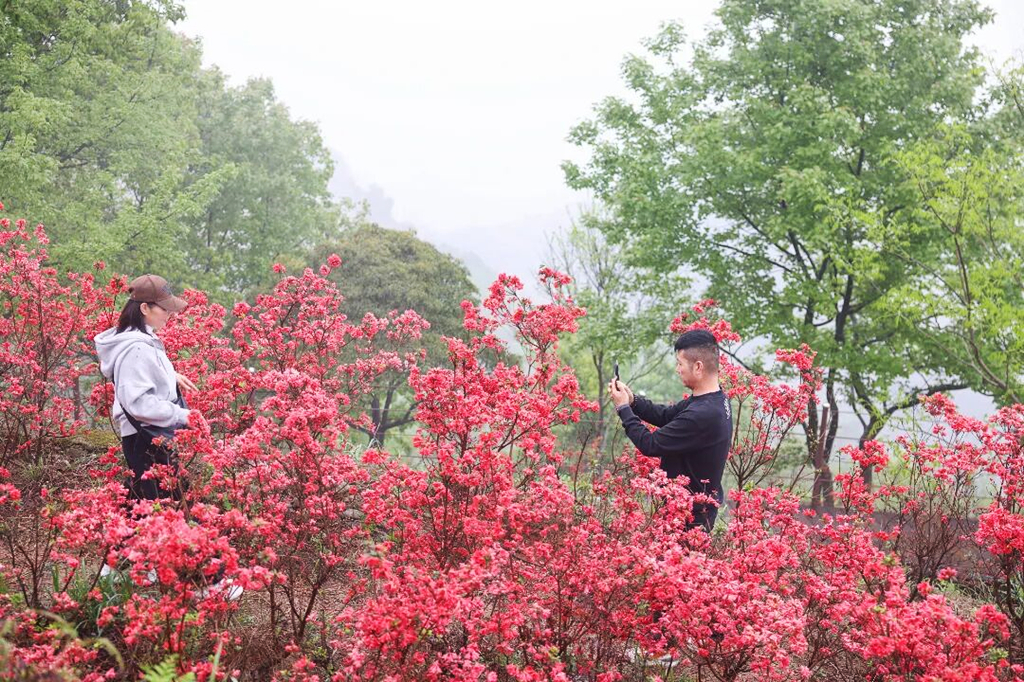 花海中的主题打卡点前,游客们纷纷留影,朋友圈里晒出的“烟雨杜鹃”收获了满满的点赞。摄影: 林鑫
