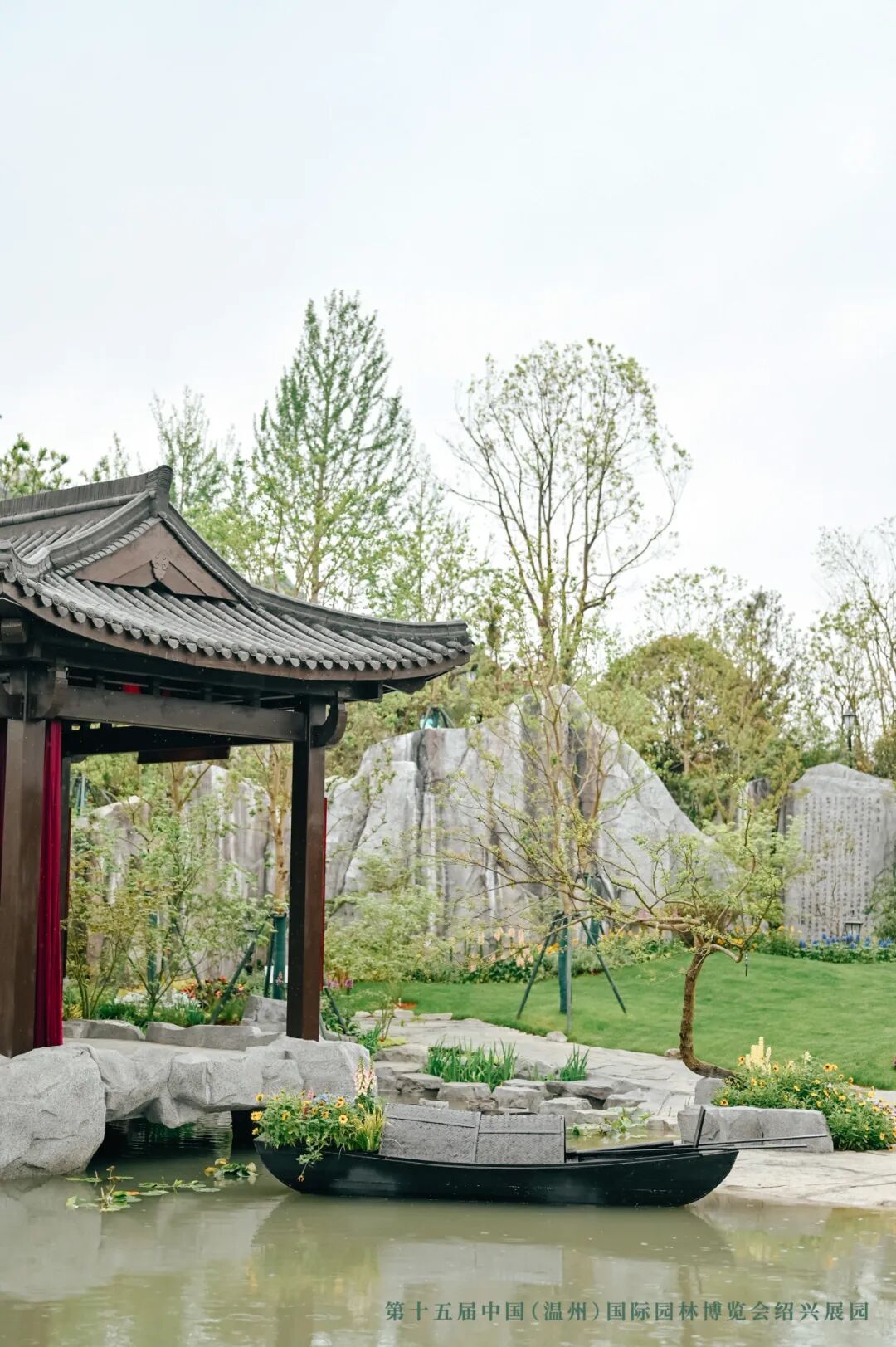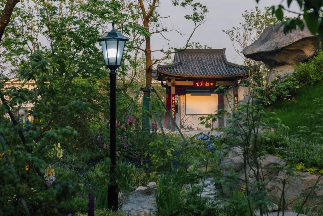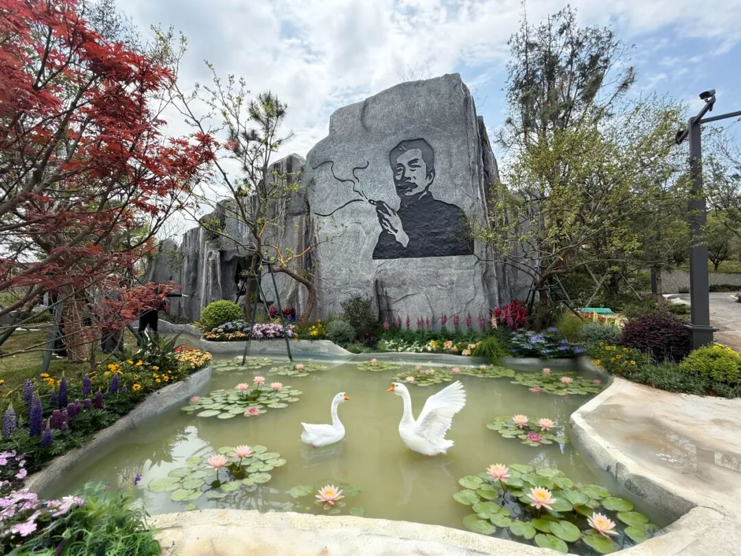 园中还有花,有戏,有诗。兰花是绍兴的市花,幽香清雅,不争不抢,却让人无法忽视它的存在。越剧是绍兴的声音,软糯糯、清亮亮,像春天的风拂过水面。草坪边的乌篷船花境,船身缀满花草,仿佛刚从鲁迅笔下的社戏中划来。戏台虽小,却能唱尽人间悲欢。你或许听不清每一句词,但那个调子一响起来,江南的味道就满了。