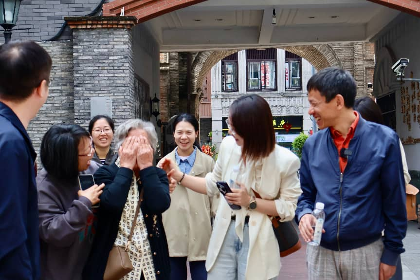 已退休的林珊老师悄然加入到迎接的队伍中。但项飙并没有第一时间认出这位惦念多年的老师,直到林珊老师报出他小学时代的名字“项曙飚”并展示旧照。项飙才戴上眼镜,仔细辨认,连声致歉。
