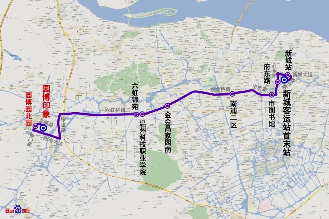 站点设置:由新城客运站首末站始发,沿途设新城站、府东路、市图书馆、南浦二区、金会昌家园南、温州科技职业学院、六虹锦苑、园博园北园,至园博印象停车点(往返)。
