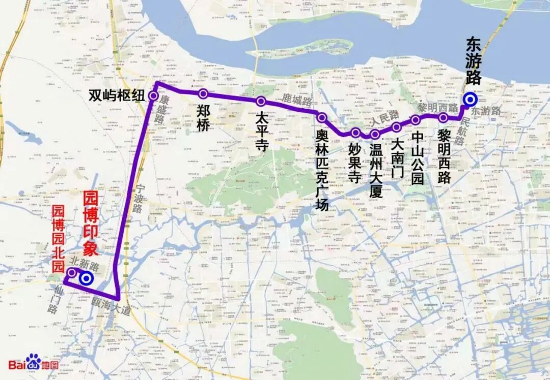 站点设置:由东游路始发,沿途设黎明西路、中山公园、大南门、温州大厦、妙果寺、奥林匹克广场、太平寺、郑桥、双屿枢纽、园博园北园,至园博印象停车点(往返)。