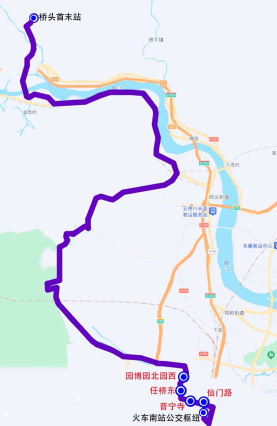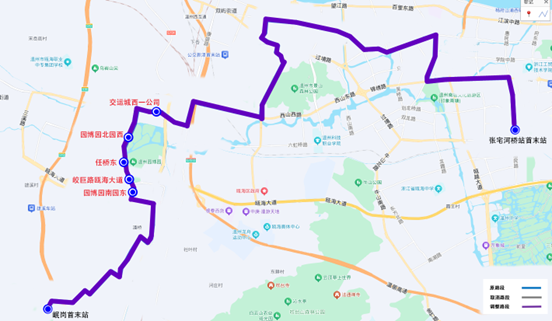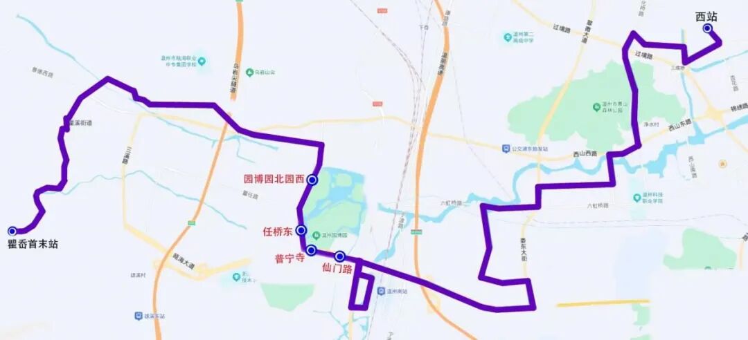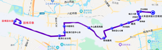 停靠站点:火车南站西广场首末站、S1动车南站、园博园南园东、皎巨路瓯海大道、任桥东、园博园北园西、园博园北园西、任桥东、皎巨路瓯海大道、园博园南园东、火车南站西广场首末站。