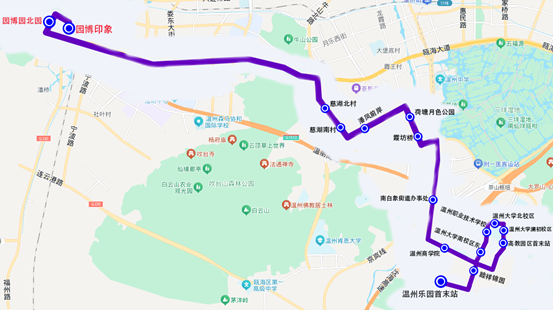 停靠站点:由温州乐园首末站始发,沿途设睦祥锦园、高教园区首末站、温州大学溯初校区、温州大学北校区、温州职业技术学院、温州大学南校区东、温州商学院、南白象街道办事处、霞坊桥、荷塘月色公园、潘凤前岸、慈湖南村、慈湖北村、园博园北园,至园博印象停车点。