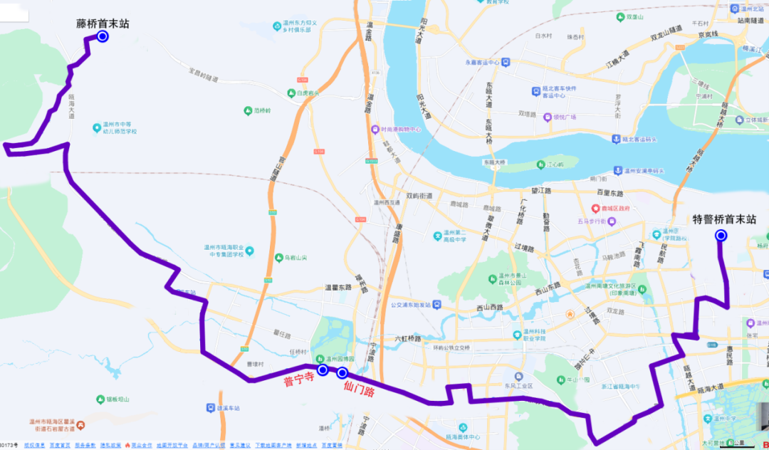 停靠站点:由特警桥首末站始发,沿途设置上新桥、横渎桥、市规划展示中心、交行广场东(中国银行)(往行)、交行广场西(返行)、鱼鳞浃、火车温州站、火车温州站广场(往行)、汽车南站(返行)、瓯江大厦(往行)、月落垟(返行)、妙鸿桥、塘西、月乐明苑(返行)、龙霞住宅区、瓯海中学、大堡底(往行)、朝霞路、蟠凤西、梧慈路东、梧慈路西、南堡、沙门、瓯海牛山实验幼儿园(往行)、高翔(全球商品贸易港)、东风、瓯海中心区首末站、瓯海大道半塘街(瓯海农商银行)、瓯海区行政中心东、瓯海法院、瓯海公安分局、玕南锦园、吕家降、古岸头、潘桥北、仙门路、普宁寺(往行)、任桥南、凰桥、浙江安防职业技术学院、瓯海大道中心路、雄溪、三溪路南、埭头、会昌路上屿、河头街、瞿溪车站、江垟、郭溪江南、岭根、泽雅大道(往行)、泽雅纸山雕塑广场(返行)、天长、泽雅卫生院、泽雅镇政府、源口北、陈垟山东、山园垅、泽雅中学北、恬山、戈恬北、桥上、雅漾北、上埠头、大唐殿、藤桥首末站。