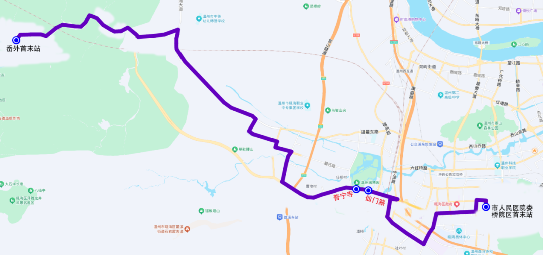 线路走向:由市人民医院娄桥院区始发,途经沉木桥街、瓯海大道、景屿路、中汇路、宁波路(返行)、瓯海大道瓯海段、豪达路、瞿任路、会昌路、温瞿西路、瓯海大道郭溪段、瓯海大道瓯海段(返行)、泽雅大道、温源线、通景路、岙外路,至岙外首末站(往返)。