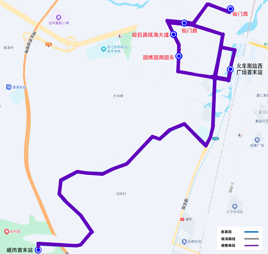 线路走向:由新城客运站首末站始发,途经万源路(往行)、绣山路、新城大道、府东路、市府路、划龙桥路、六虹桥路、宁波路、瓯海大道、仙门路、北新路,至园博印象停车点(往返)。
