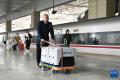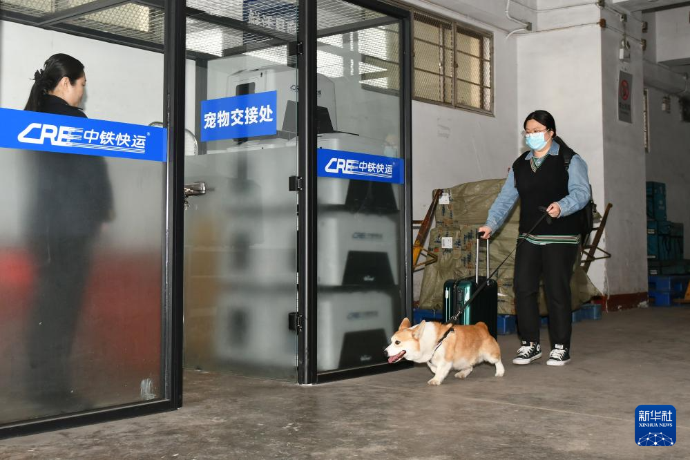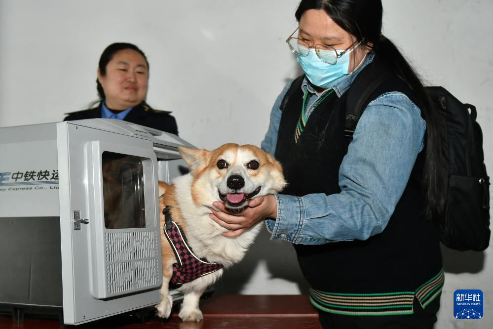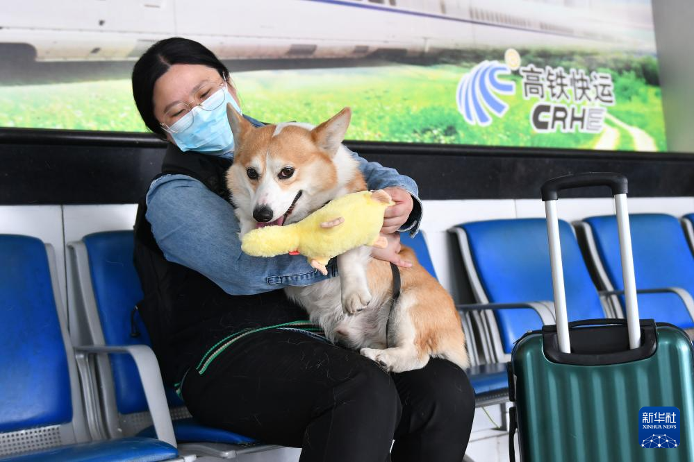 4月8日起,铁路部门推出“爱宠行”服务,提供“携宠出行”与“爱宠单独行”两种托运模式,更好地满足旅客多样化需求。4月14日,在山东烟台站,旅客在办理托运手续前与宠物狗互动。新华社发(孙文潭摄)