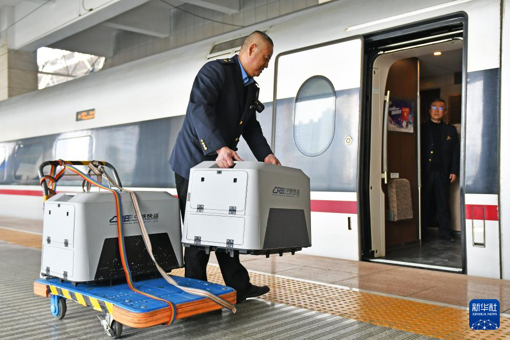 4月14日,在山东烟台站,工作人员将专用宠物运输箱转运至列车车厢。新华社发(孙文潭摄)
