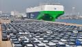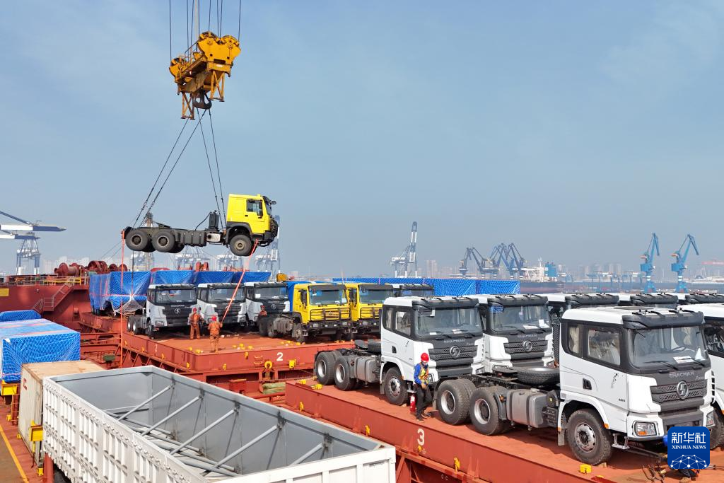 4月14日,出口几内亚的卡车在山东港口烟台港装入中非班轮(无人机照片)。新华社发(唐克摄)