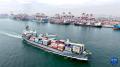 4月14日,在山东港口青岛港,装载外贸集装箱的货轮驶离港口(无人机照片)。新华社发(俞方平摄)