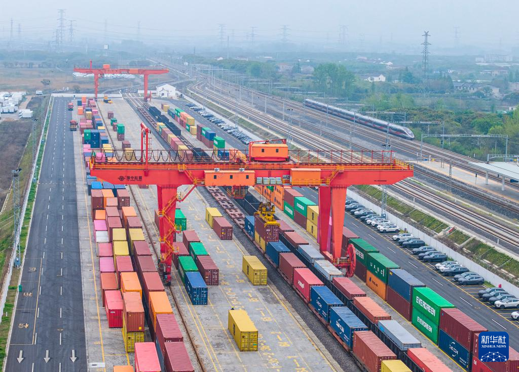 4月14日,在南京铁路物流中心江都物流基地内,大型起重设备将集装箱吊装到海铁联运列车,准备出口(无人机照片)。新华社发(任飞摄)