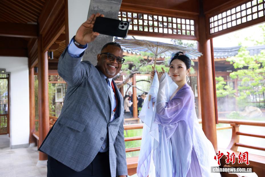 4月15日,杭州园内,国际友人与表演者合影留念。记者 孙杨洋 摄