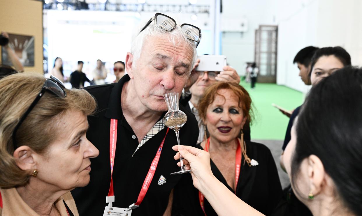 4月13日,观众在第六届消博会主会场品鉴沉香。新华社记者 杨冠宇 摄