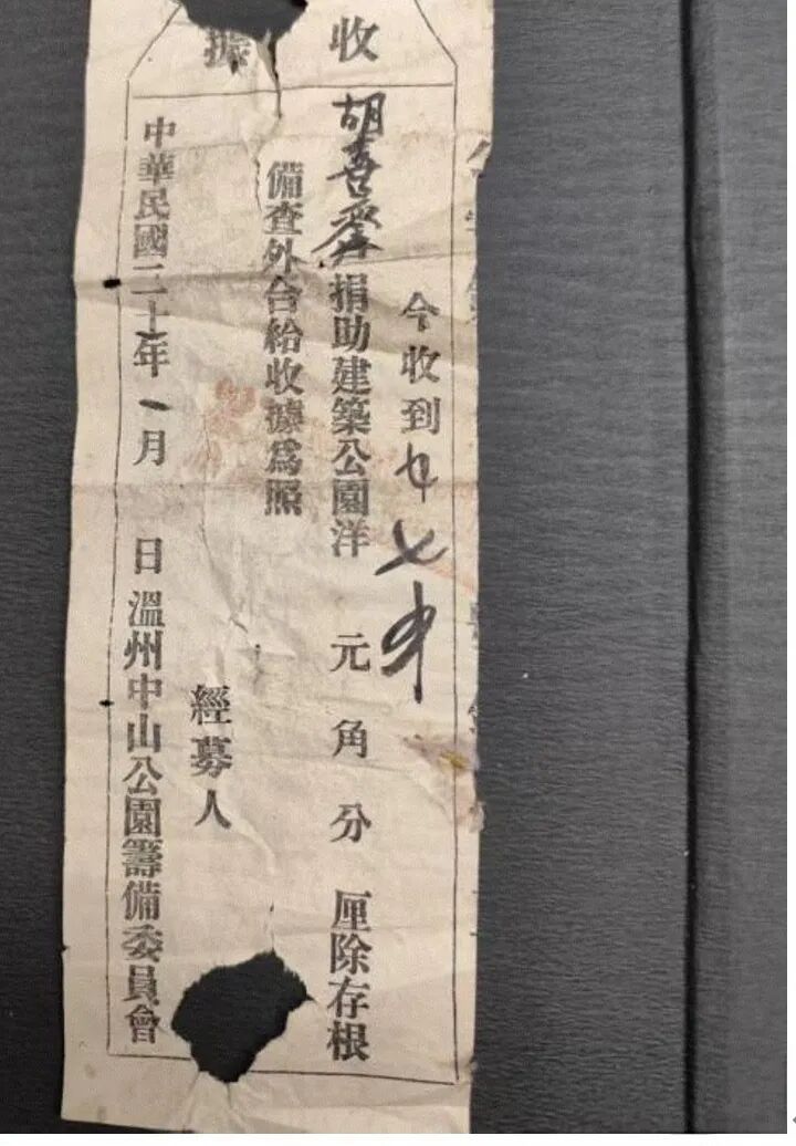 温州中山公园筹备委员会募款收据 温州市文史研究馆藏
