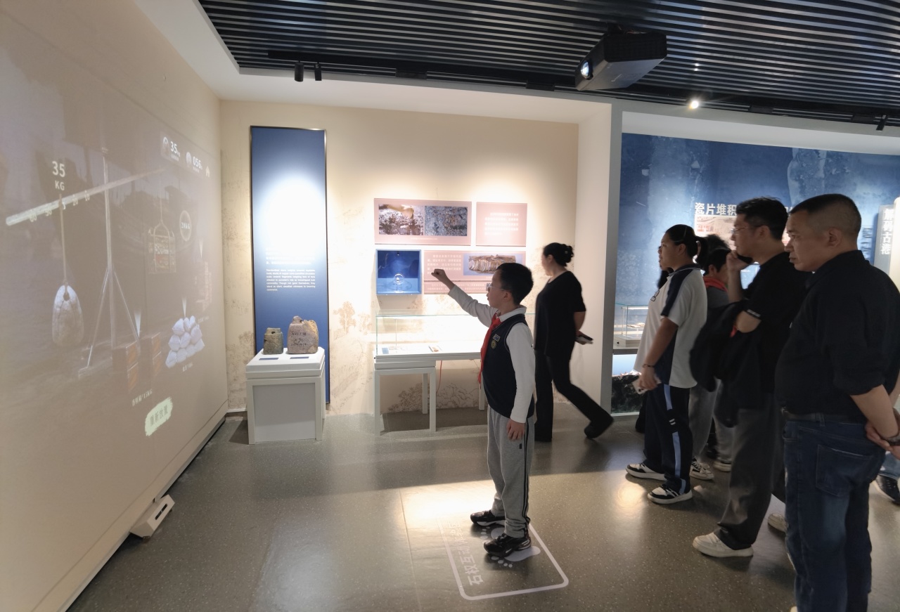 朔门古港出土文物以民用、商用器物居多。策展团队凭借细腻的展陈文字、生动的叙事视角与巧妙的互动设计,让这些寻常旧物拼合出一幅真实鲜活的港城画卷。为了让历史从展柜延伸至指尖,馆内专门设置了互动体验区。观众可通过互动装置亲手为元代石权“搬运称重”,感受大宗贸易的分量;亦可触摸不同窑口的古瓷片标本,通过触觉直接感知历史的质感与温度。