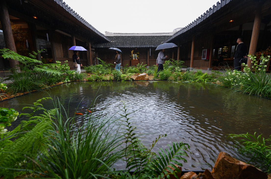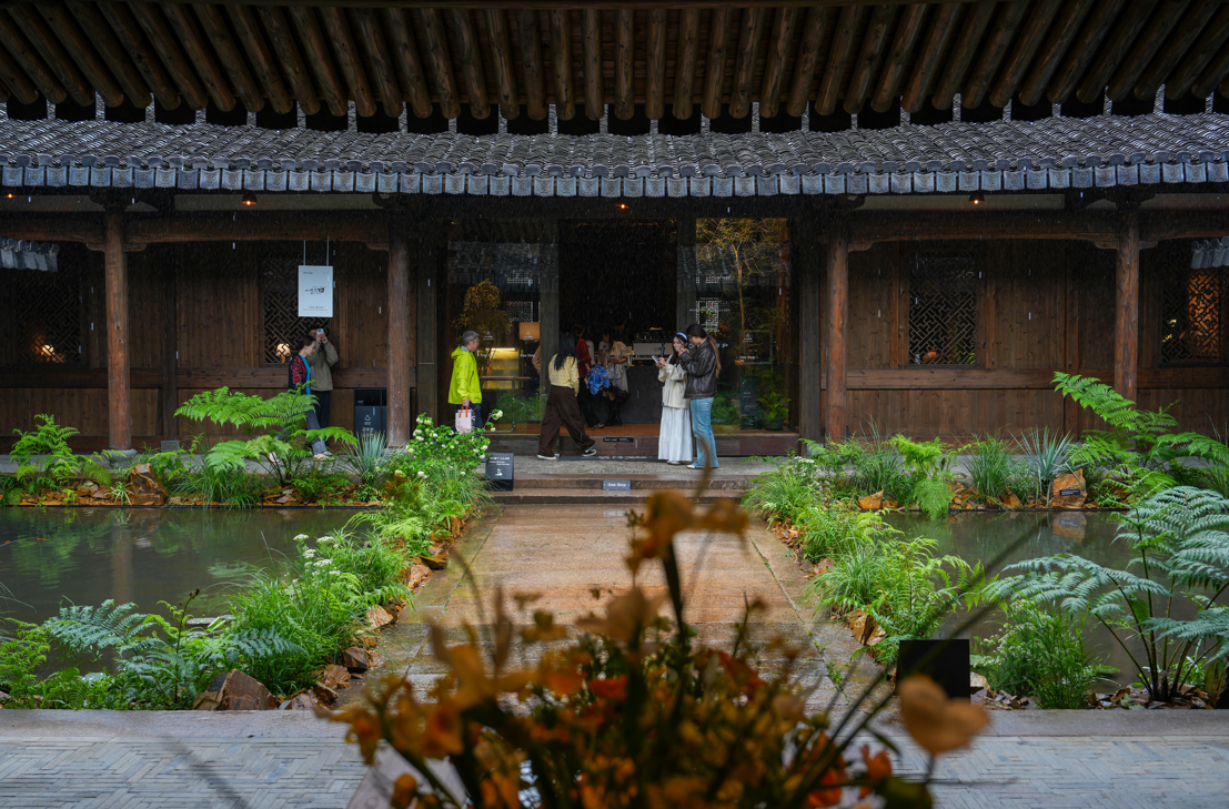 店面设计采用了半开放式的木结构建筑,店内各类绿植与手工木作家具点缀其间,为市民游客们带来了一份别样的文化品味。同时,艺术展览“垟间花事”胡蓉作品展同步揭幕。