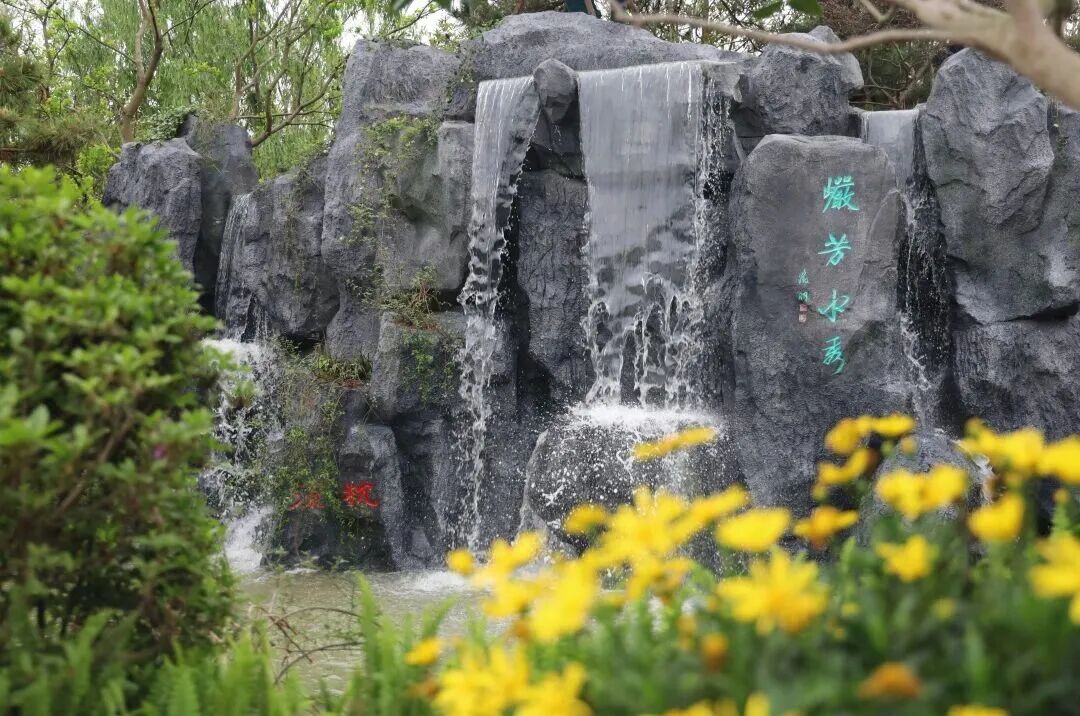 展园以山环水抱、水分山围为天然架构,远借郭公阁,内造瀑布、花溪、松林,实现“纳景入园、山水融合”的无界之境。南部花溪蜿蜒婉转,分隔内外空间;泉、瀑、池、溪错落串联,三步一景、五步一水,灵动生趣。