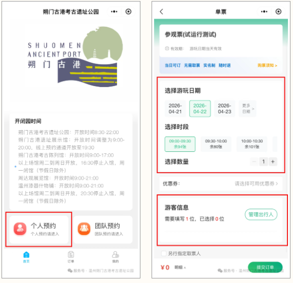 朔门古港遗址展示馆每周二至周日开放时间调整为9:00—20:00(周一闭馆),线上预约通道开放至19:30,请合理规划参观时间,按预约时间段入园参观。公园实行免费入园,目前有西入口、东入口(东瓯大厦)及南入口(解放街)多个入口。需要注意的是遗址展示馆与考古陈列馆需提前预约,其中遗址展示馆同时段限流400人。