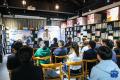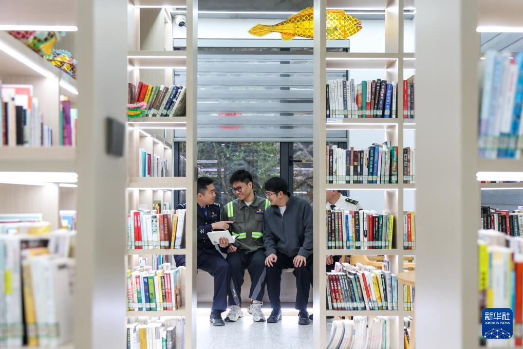 4月22日,在温州市洞头区垅头城市书房,温州海事局工作人员在“真人图书馆”活动上与温州港状元岙港区工人交流。新华社记者 江汉 摄