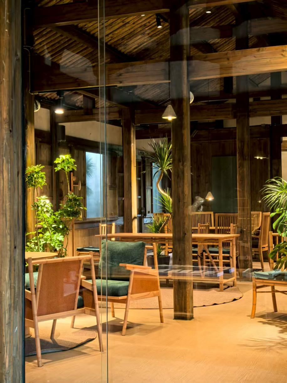 如今,走进老宅,暖黄的灯光与葱茏的绿植柔和地点缀于空间之中,与古朴的柱廊、花格窗相映成趣。点一杯咖啡,与古建开启一场无声的对话——历史未曾远离,只是换了一种方式,温柔地落入了当下。历史建筑的厚重感和现代生活的松弛感,在这里毫不违和地交融在一起。