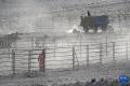 在新疆卡拉麦里山有蹄类野生动物自然保护区,野放的普氏野马冲出围栏(4月22日摄)。