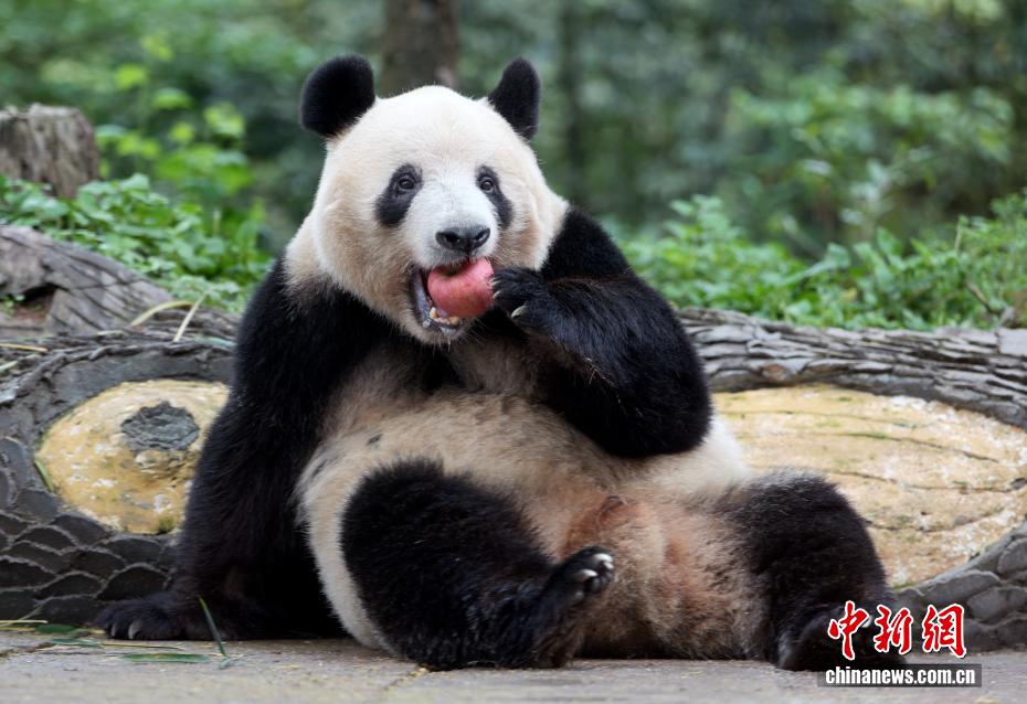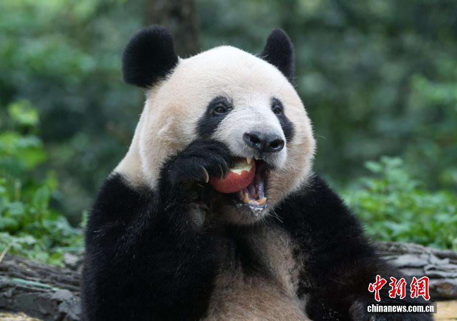 图为大熊猫“香香”在吃苹果。中新社记者 安源 摄