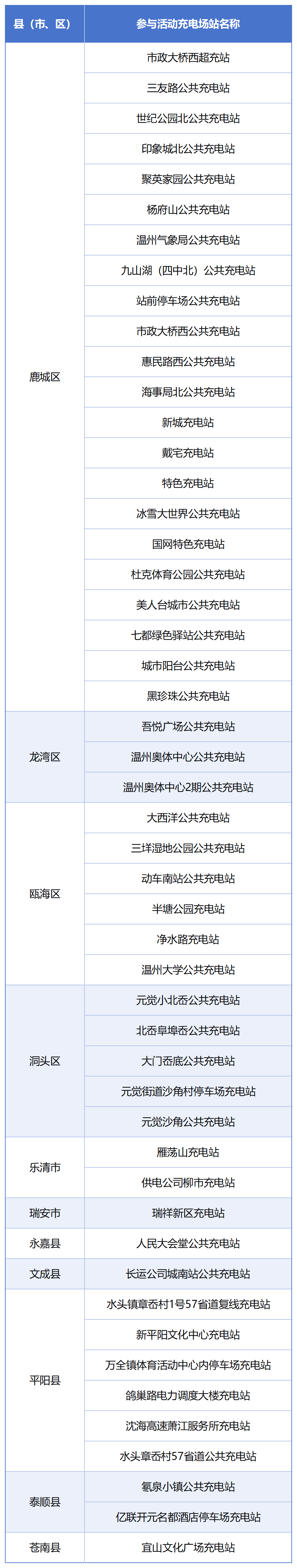 车主可在活动期间享受全天充电服务费5-6折超值让利,无需区分时段(五一期间10点至14点为电价深谷时段,充电更优惠),实惠直达每一位车主。本次活动依托“国网E充电”平台开展,全市精选50座优质充电站同步参与,覆盖鹿城、龙湾、瓯海、洞头、乐清、瑞安、永嘉、文成、平阳、泰顺、苍南11个县(市、区),无论是市区通勤、商圈停靠,还是县域出行、景区游玩,都能就近找到优惠充电站点,真正实现全域畅行无忧。