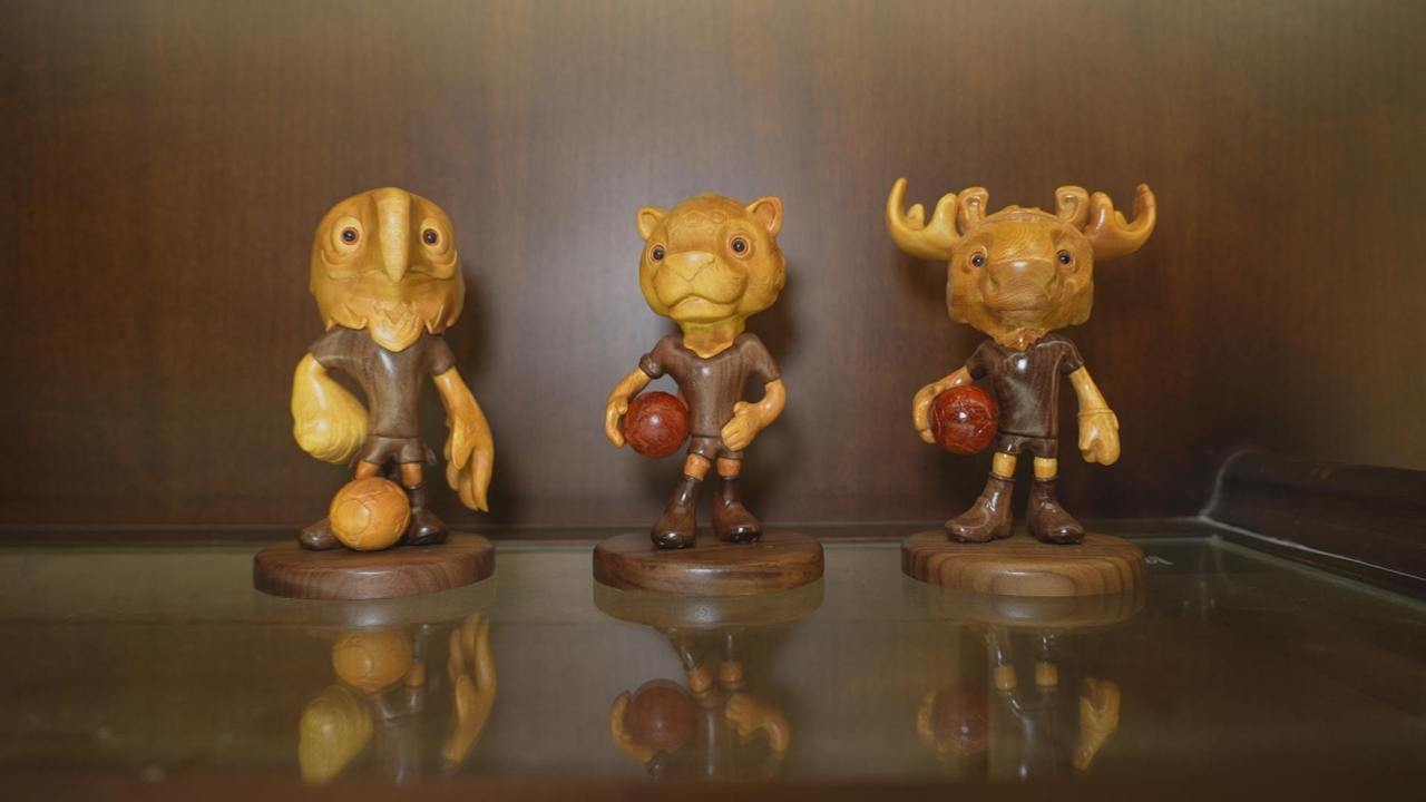 以三大官方吉祥物为原型设计的黄杨木雕手办。