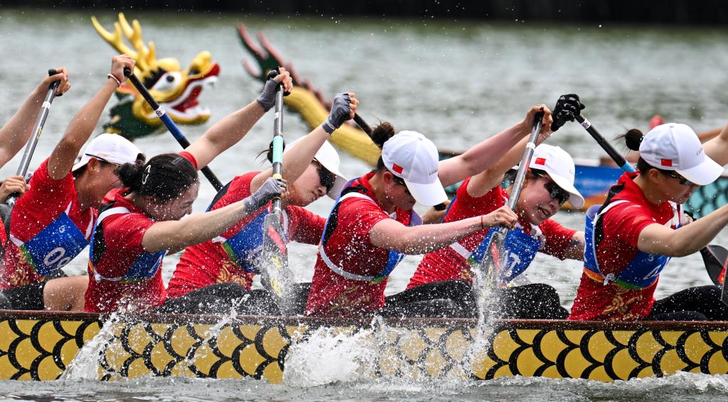 继24日问鼎12人龙舟100米直道赛后,中国女队再获200米直道赛金牌。当日进行的预赛中,中国女队排名第二。决赛中,中国女队起步迅猛、整齐发力,前半程就以势如破竹之势拉开差距,最终以51.964秒的成绩强势夺冠,泰国队、越南队分获第二、三名。