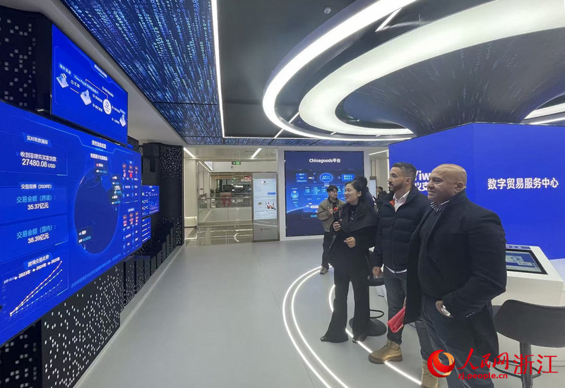 义乌全球数贸中心二楼,外商正在观看“出海”数据。人民网记者 王丽玮摄