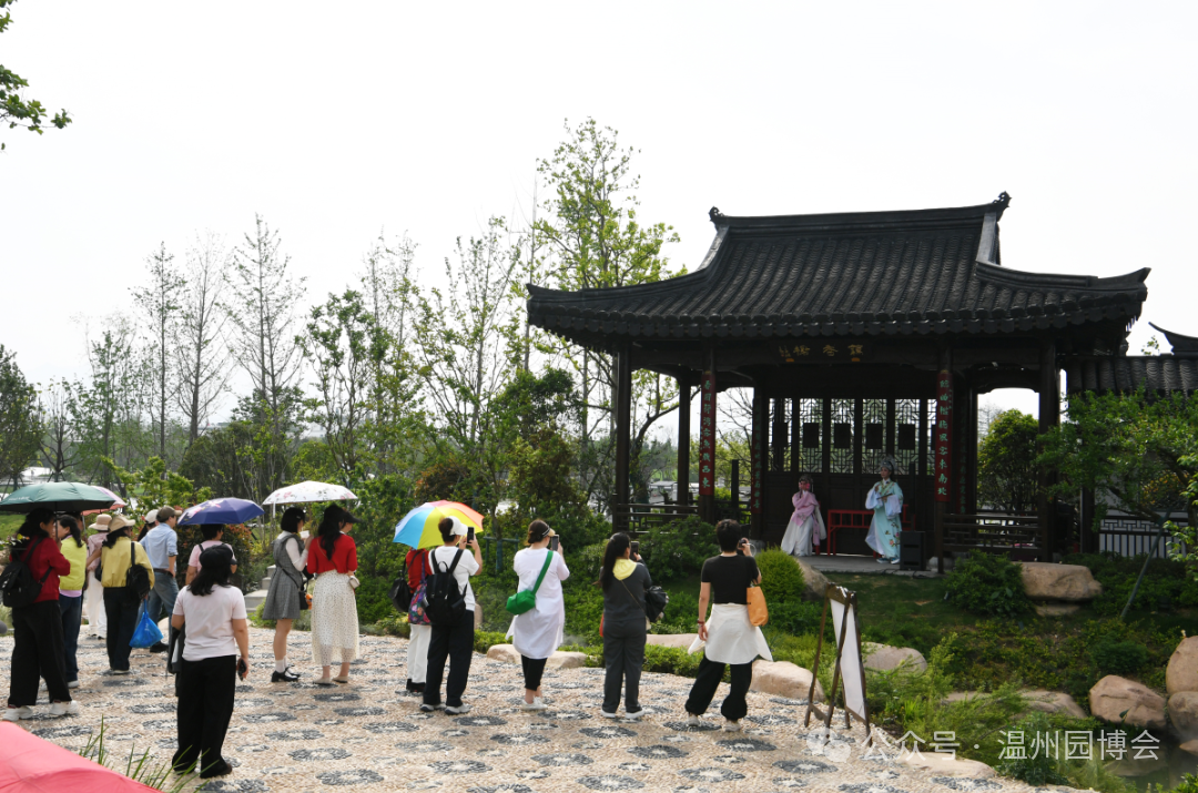 迈出渡口,穿过绣球花丛,就是瓯越园的核心区域“戏韵荷风”。一方水池,依依垂柳,几支小荷,就营造出了谢灵运笔下“池塘生春草,园柳变鸣禽”的意境。眼前的一座虹桥,采用了泰顺廊桥的造型,桥边长廊自北侧入口曲折蜿蜒,与戏台相连。这座戏台名为“藕香榭”,借鉴了芙蓉古村陈氏大宗祠戏台和花坦花三三官亭的形制,正是园博十二景中的“南戏清音”所在。台上偶有南戏剧目咿呀响起,声韵雅致,仿佛一下子把人拉进旧日时光。园博会期间,藕香榭每天至少安排一场演出,周末及节假日增至三场,永昆、瓯剧、越剧、高腔、乱弹等剧种将轮番登台,是园中最佳的赏玩点。